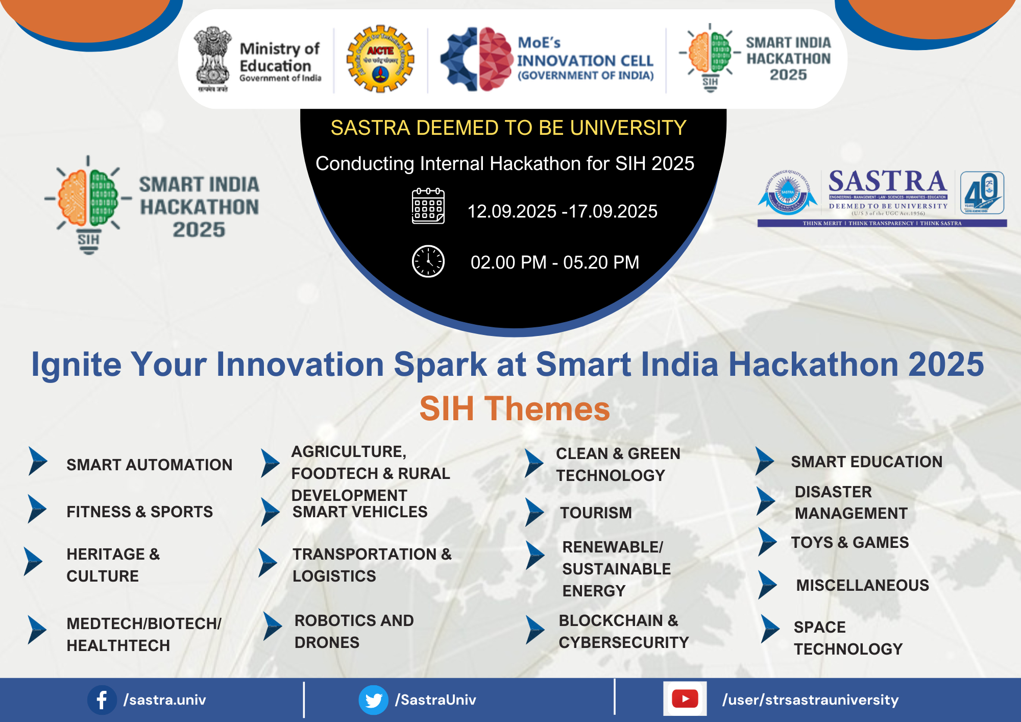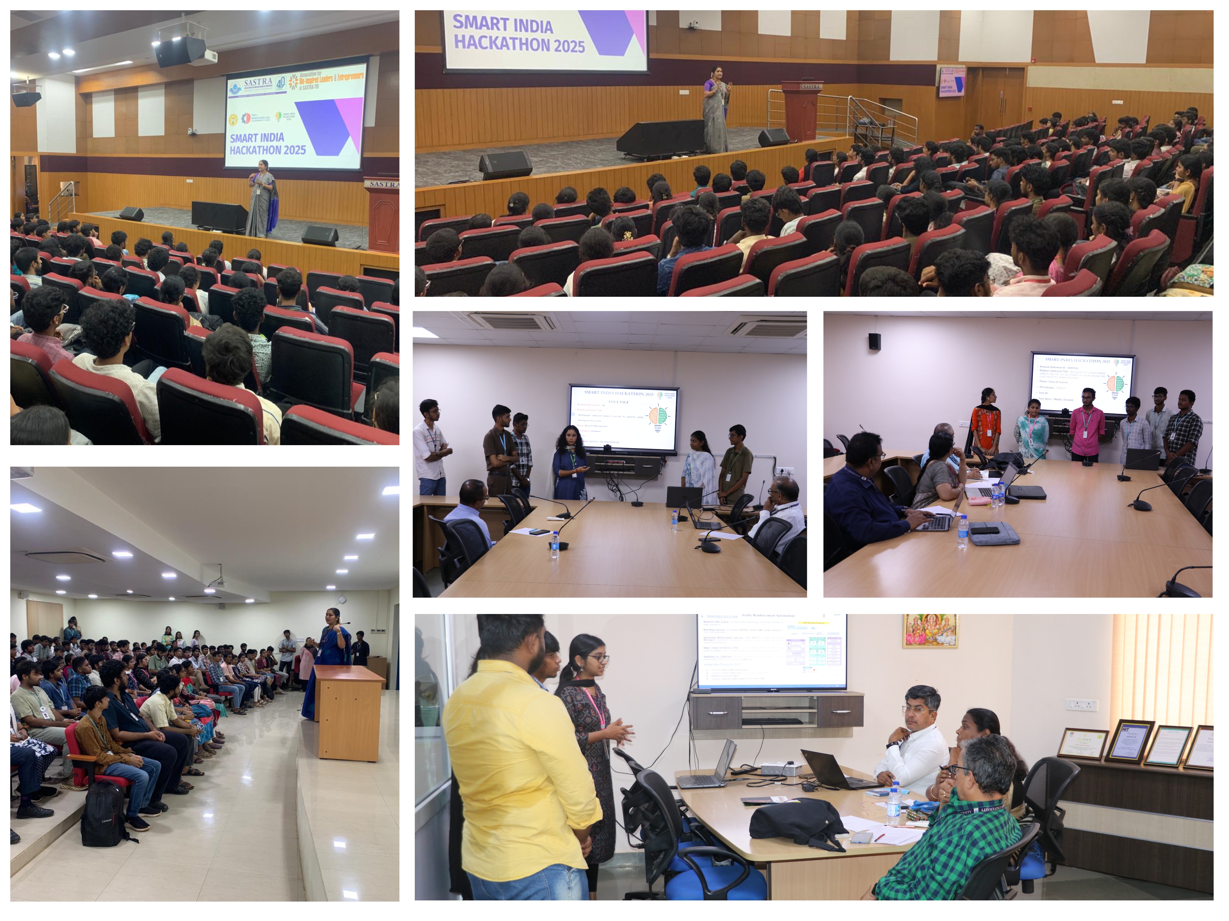Successful completion of the Internal Hackathon as a part of Smart India Hackathon 2025 at SASTRA Deemed University. Shortlisted teams will move forward to represent SASTRA at the national SIH 2025.