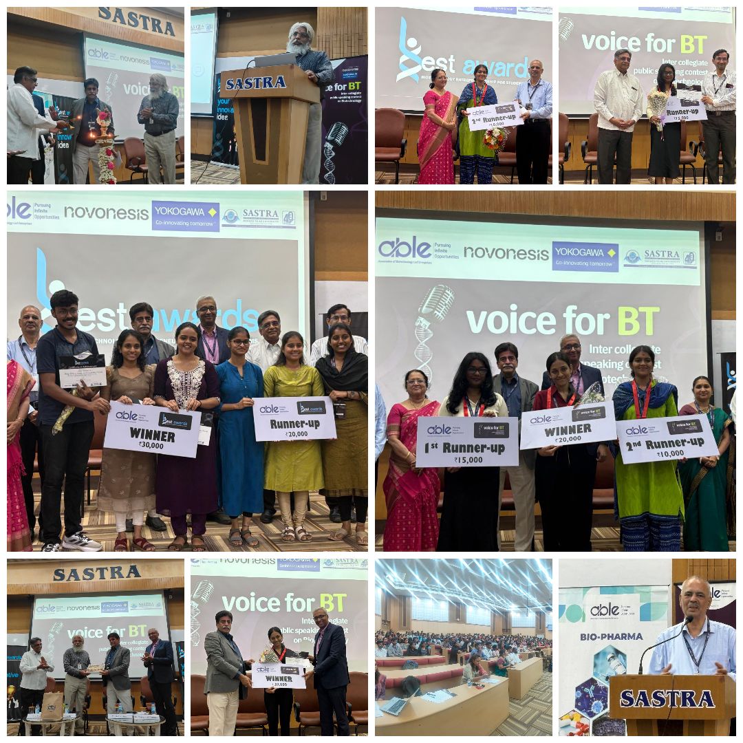 SASTRA Deemed University was selected as the South Zone Coordinator and Host Institution for the Voice for BT 2025 and the BEST Program, organized by the Association of Biotechnology Enterprises (ABLE). ABLEST – SASTRA successfully coordinated the South India edition with the support of ABLE, Novonesis, and Yokogawa Technology Solutions India Pvt. Ltd. The events brought together 20 academic colleges and institutes, with 19 students participating in the Voice for BT event and 9 teams (3 students per team) competing in the BEST Program, where students showcased innovative ideas and explored emerging biotechnology trends.