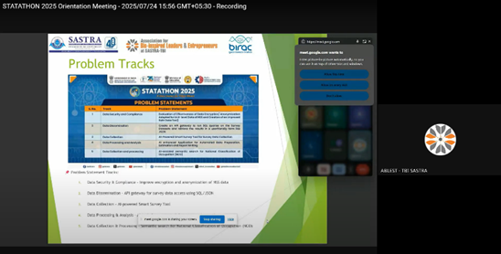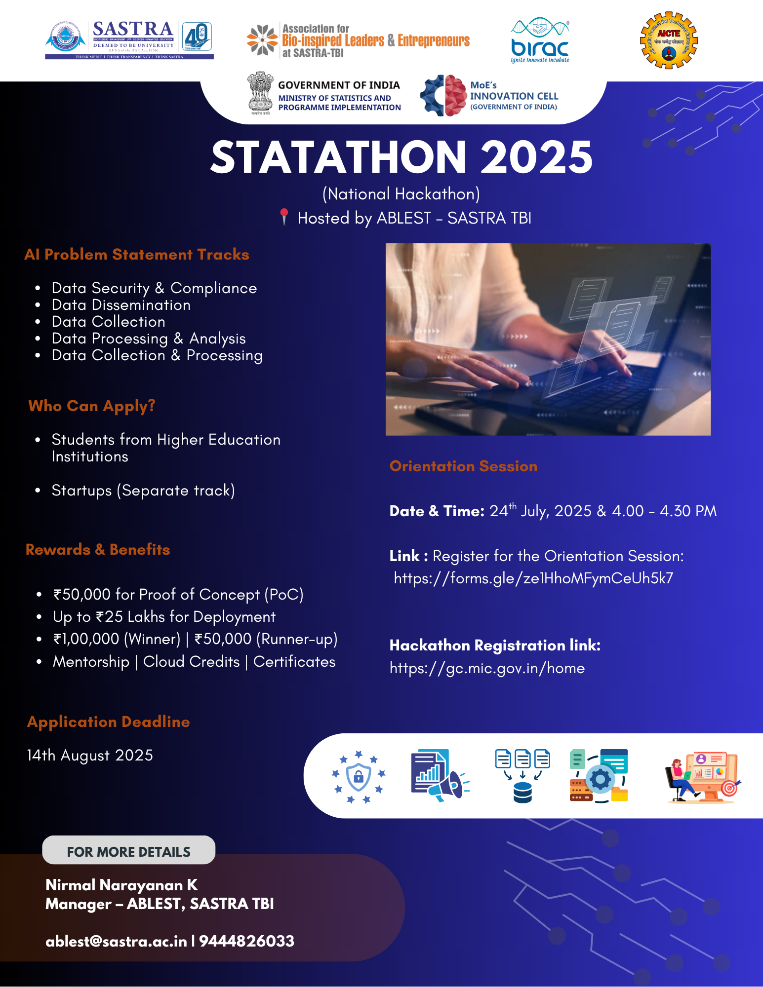 ABLEST conducted an online orientation session for students of SASTRA Deemed University as part of STATATHON 2025—a data-driven hackathon designed to foster innovation and problem-solving in the areas of statistics, data science, and artificial intelligence.